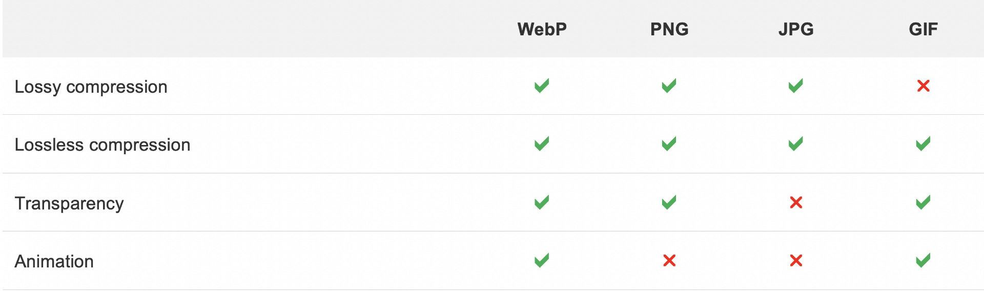 WebP is an incredibly useful format because it offers both performance and features. Unlike other formats, WebP supports both lossy and lossless compression, as well as transparency and animation. Which makes it the perfect tool for web designers to produce rich visual content that will only enhance the user experience.